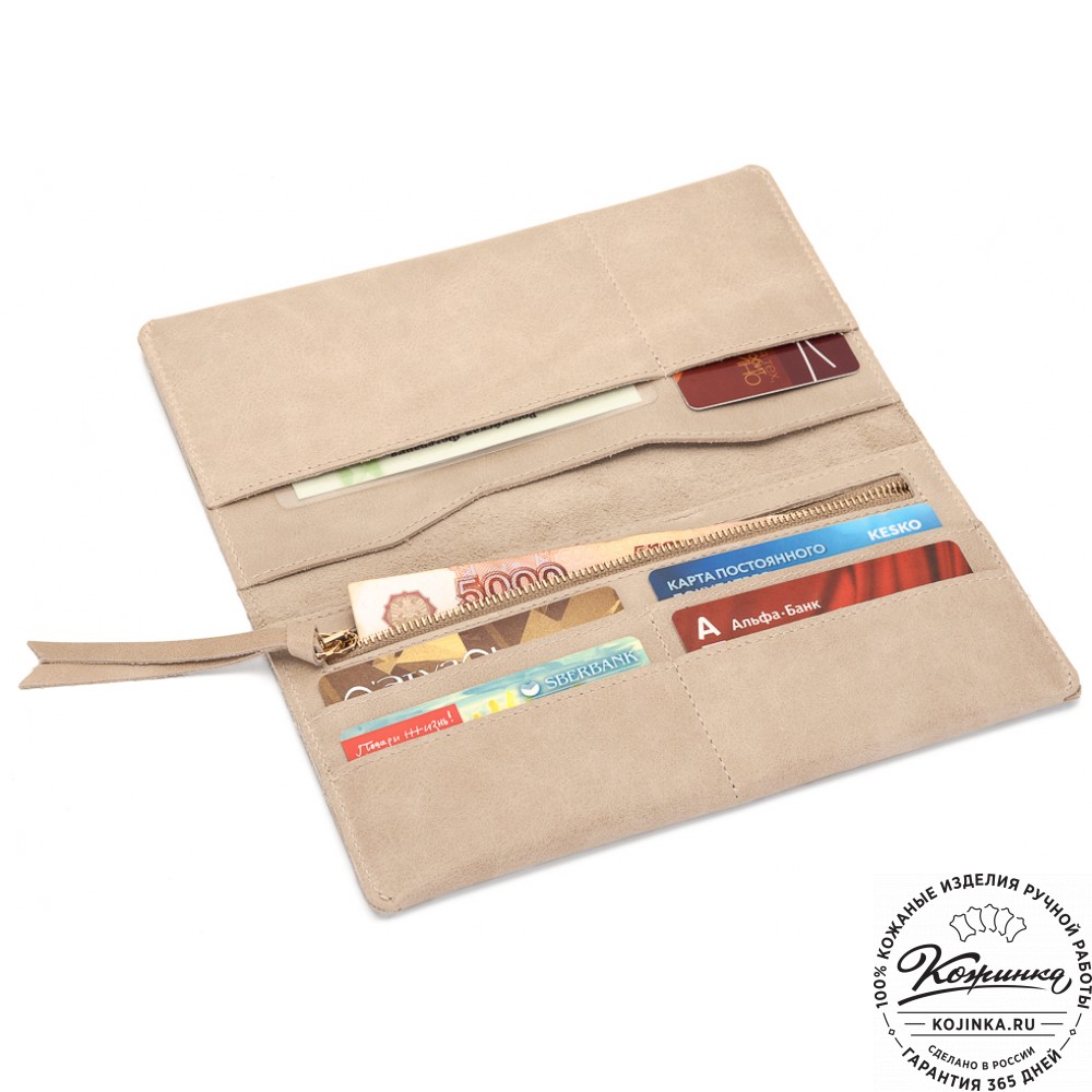 Портмоне вместит в себя много наличных денег, монеты в специальном отделении на молнии, пластиковые карты и даже чеки от покупок в магазинах. Все отделения с подкладом, аккуратно прострочены.