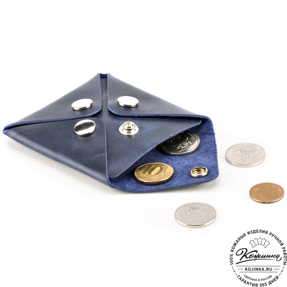 Монетница изготовлена из прочной натуральной кожи. Закрывается на кнопку.