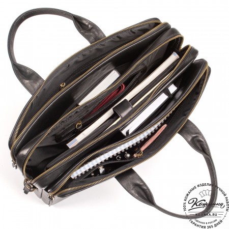 В портфеле два отделения для бумаг, документов или ноутбука с диагональю до 13 дюймов.