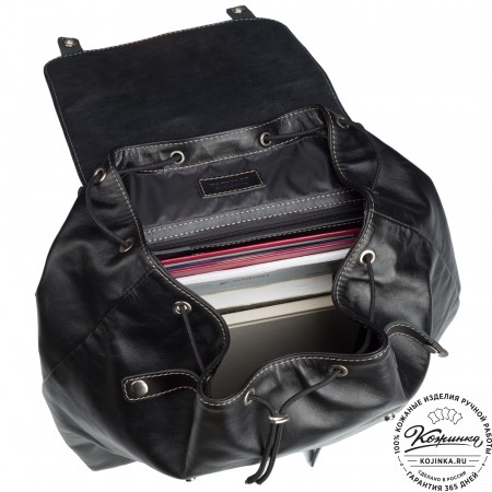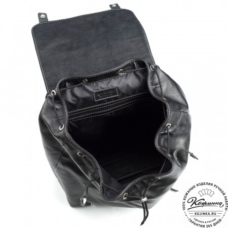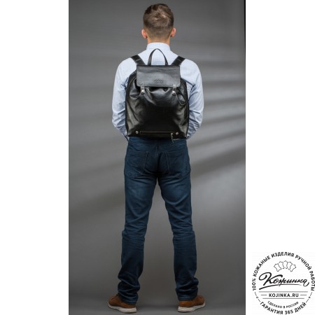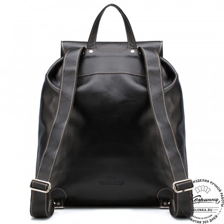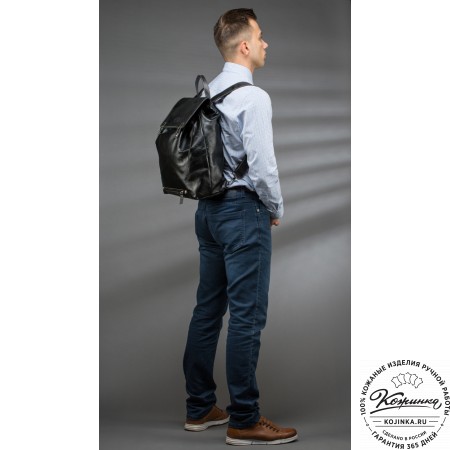 На модели представлен рюкзак "Посейдон" из кожи чёрного цвета.