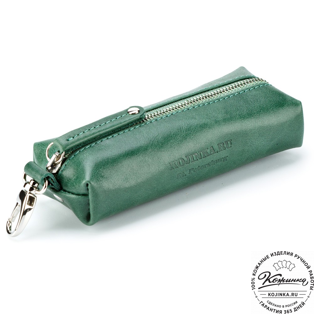 Ключница на молнии, внутри кольцо для ключей, снаружи небольшой карабин. У молнии длинный удобный пуллер из кожи.