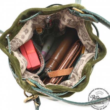 В комплекте с сумочкой идет кожаная ключница на молнии, которую можно прикрепить внутри на небольшой карабин, для чего предусмотрены специальные петельки.